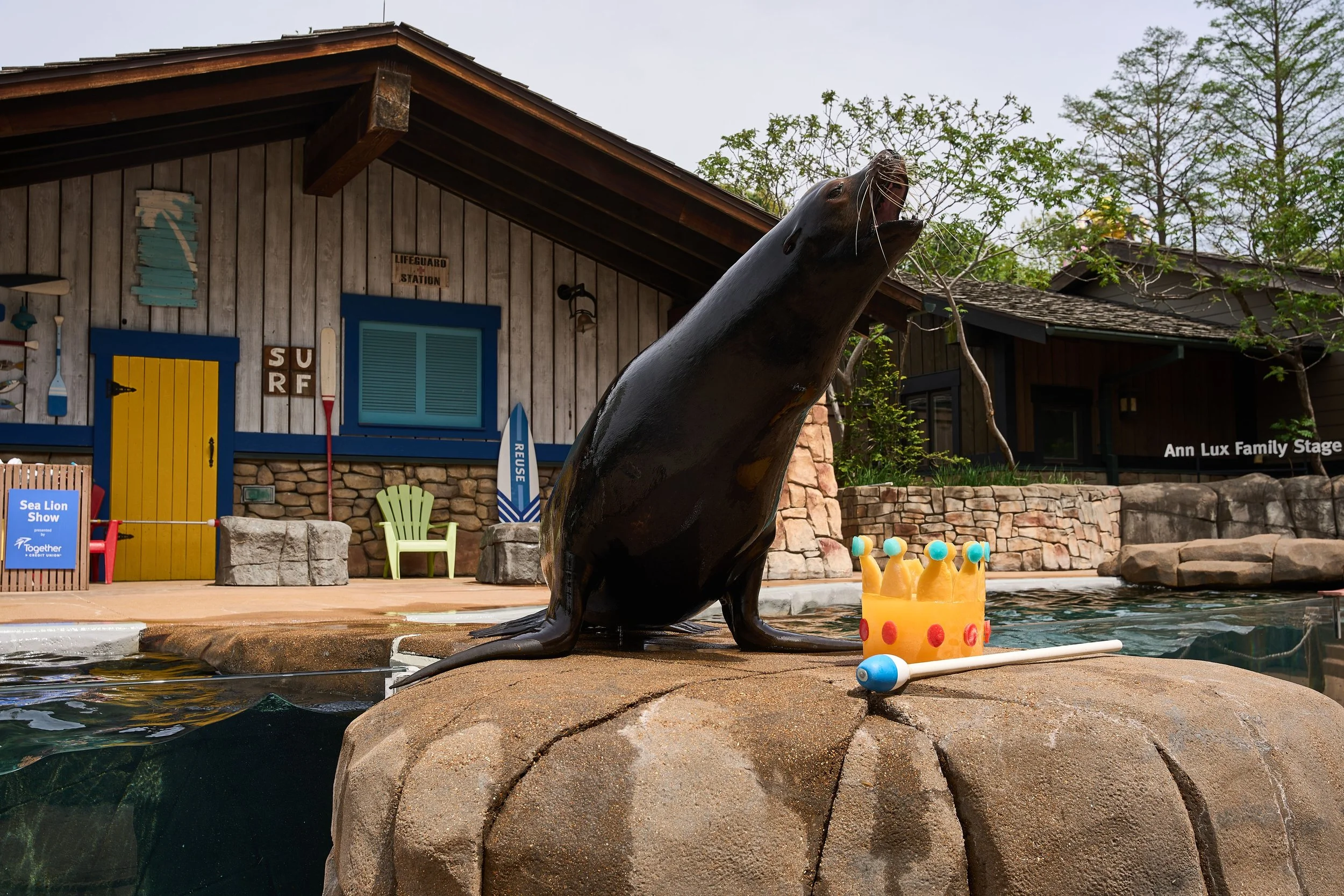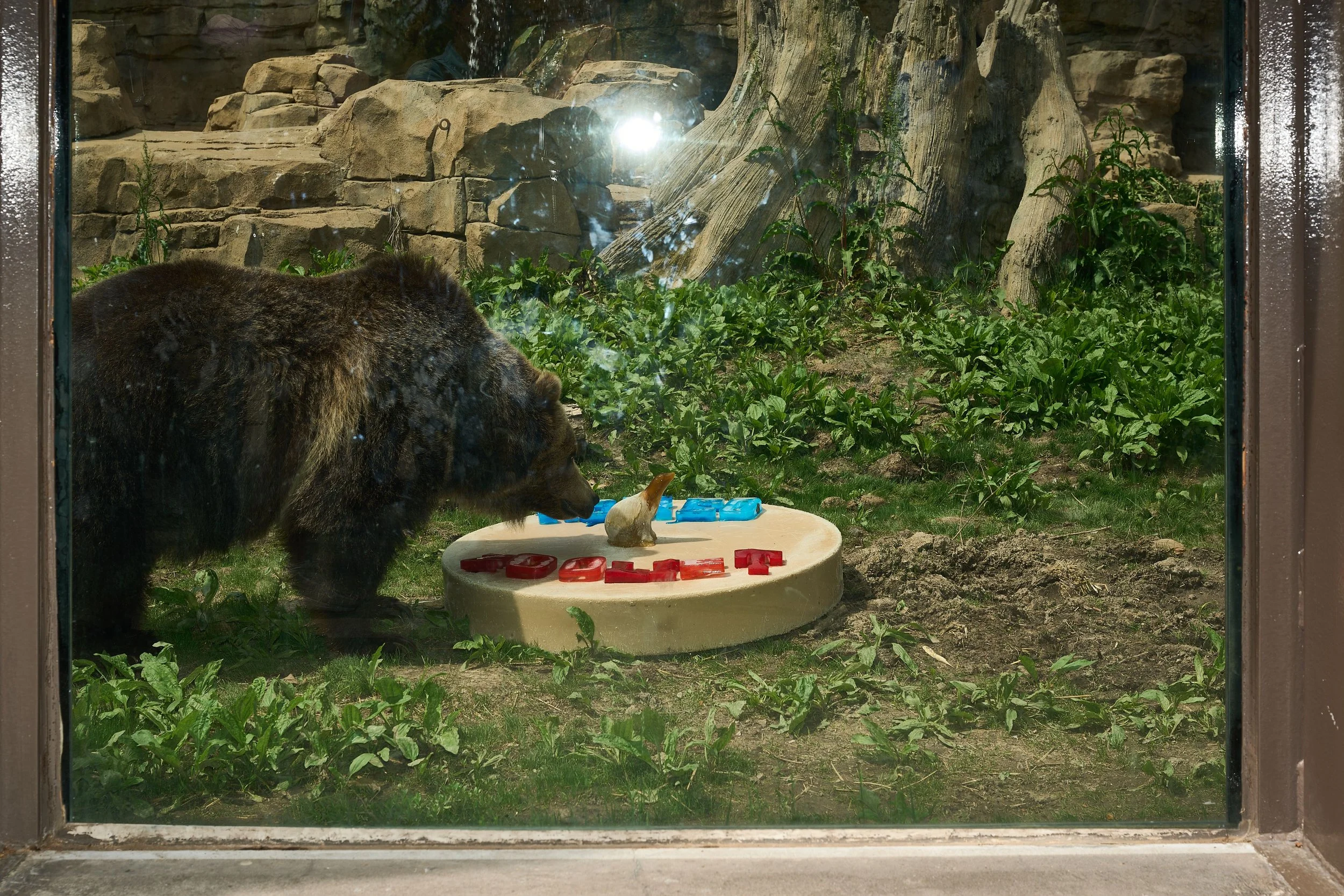 The Zoo's Animal Care and Animal Nutrition Service Teams designed an ice crown and scepter for one of the male sea lions and an ice-stack birthday "cake" for the grizzly bears. The icy treats include some of the animals' favorite foods such as fish and pieces of produce.