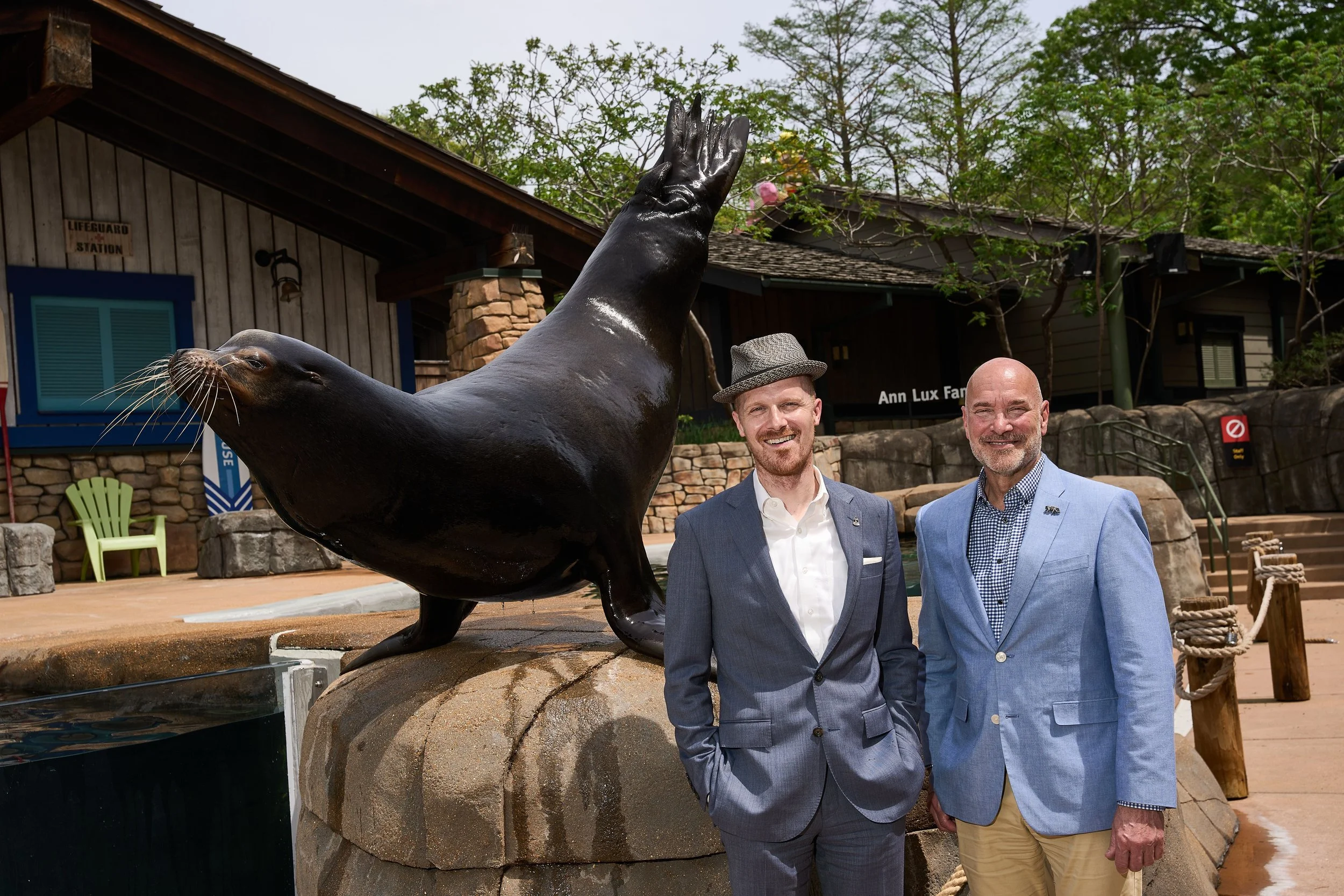 California Sea Lion Roby with St. Louis Shakespeare Producing Artistic Director Tom Ridgely and Saint Louis Zoo Director Michael Macek.