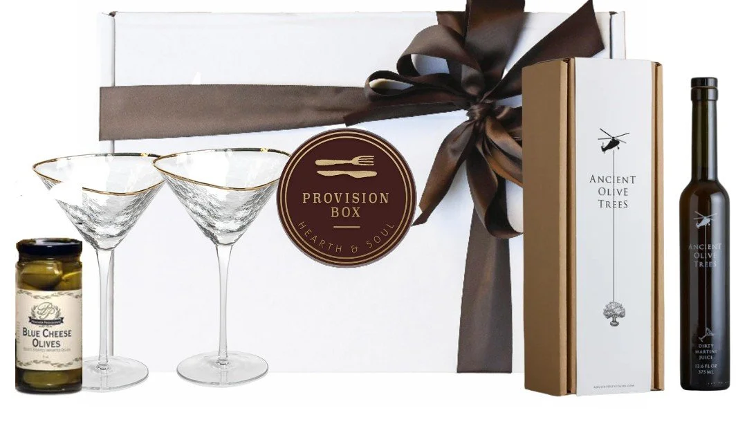 Martini Lovers Specialty Box - Elevate any martini lover's spirits with our Specialty Box! This perfect gift includes 2 Martini Glasses, Ancient Olives Dirty Martini Juice, and Peaches Provisions Blue Cheese Olives. A deliciously unique way to quench their thirst and satisfy their taste buds!