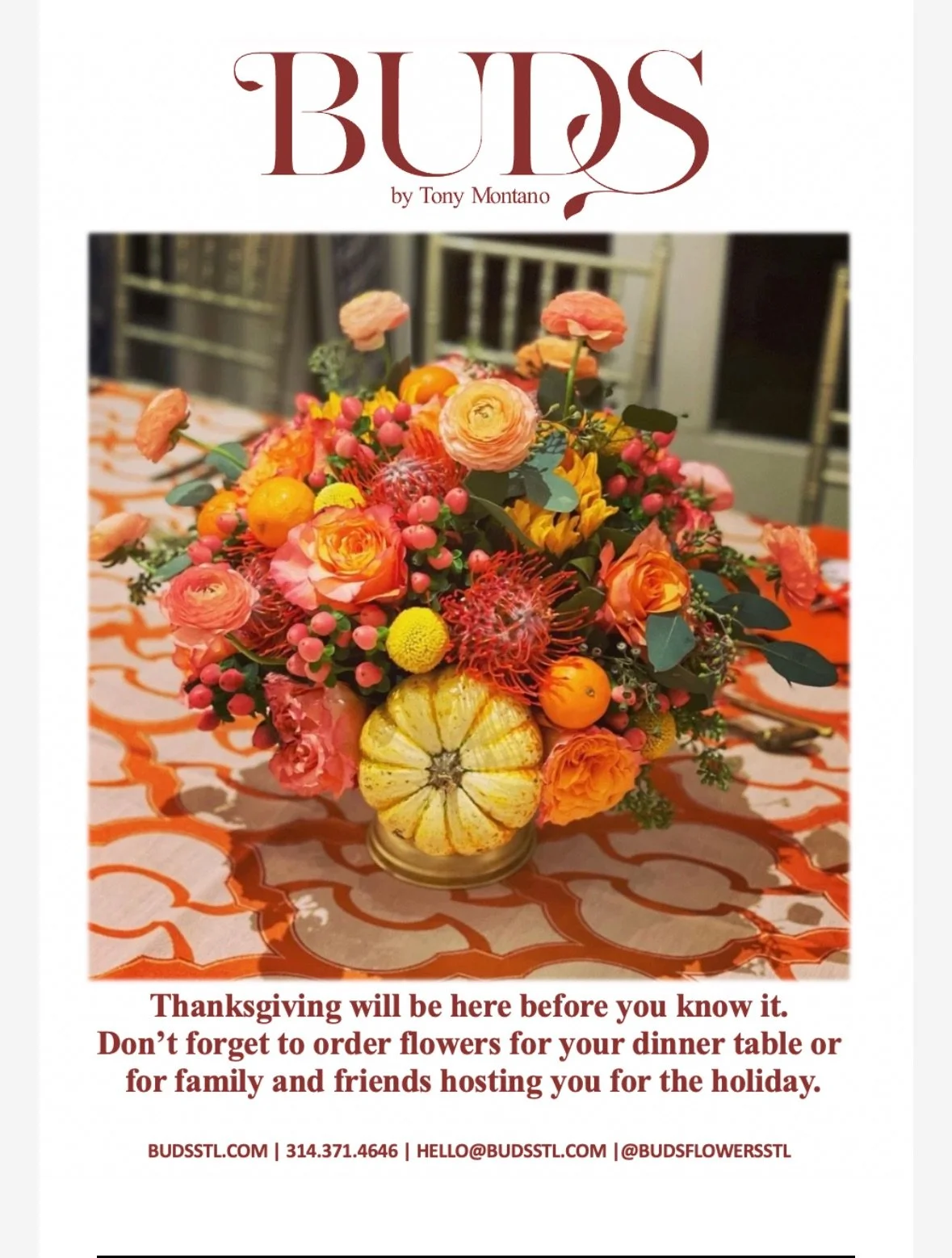 Nothing says, “Happy Holidays,” like a custom-designed bouquet of fresh flowers or unique gift from BUDS, St. Louis' premier designer of floral arrangements. Whatever you choose will be custom designed by BUDS owner Tony Montano and is sure to make your Thanksgiving, Christmas, Hanukkah, Kwanzaa, or New Year’s memorable.