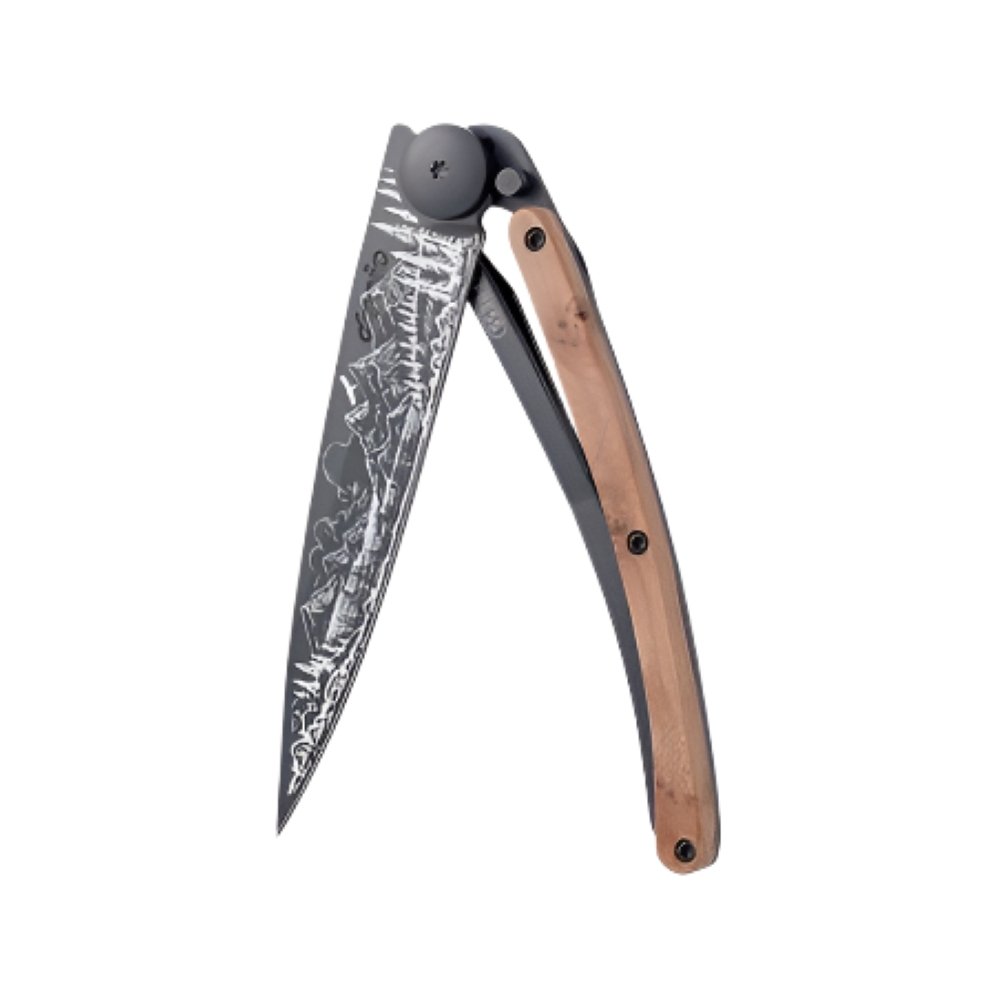 Deejo Juniper Wood Knife - Ultra-light knife in Z40C13 stainless steel, black titanium finish. Blade with secure liner lock system decorated with fine laser engraving. Belt clip. Juniper wood handle.