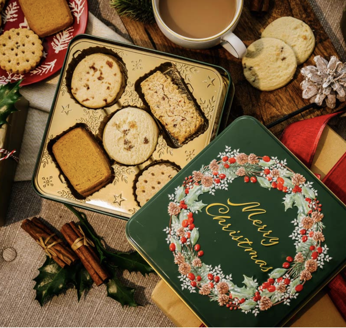Christmas Wreath Festive Selection Tin - Containing Spiced ginger biscuits, Milk & white chocolate chip biscuits,Fruit & spice biscuits, Salted caramel biscuits, and Cranberry & oat biscuits.