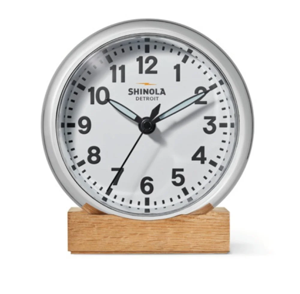 Shinola Runwell Desk Clock - The perfect gift for the one who doesn't let time get away from them, this Runwell Desk Clock—which nests in a handsome oak stand—features iconic details of the Runwell Wall Clock, but in a smaller size.