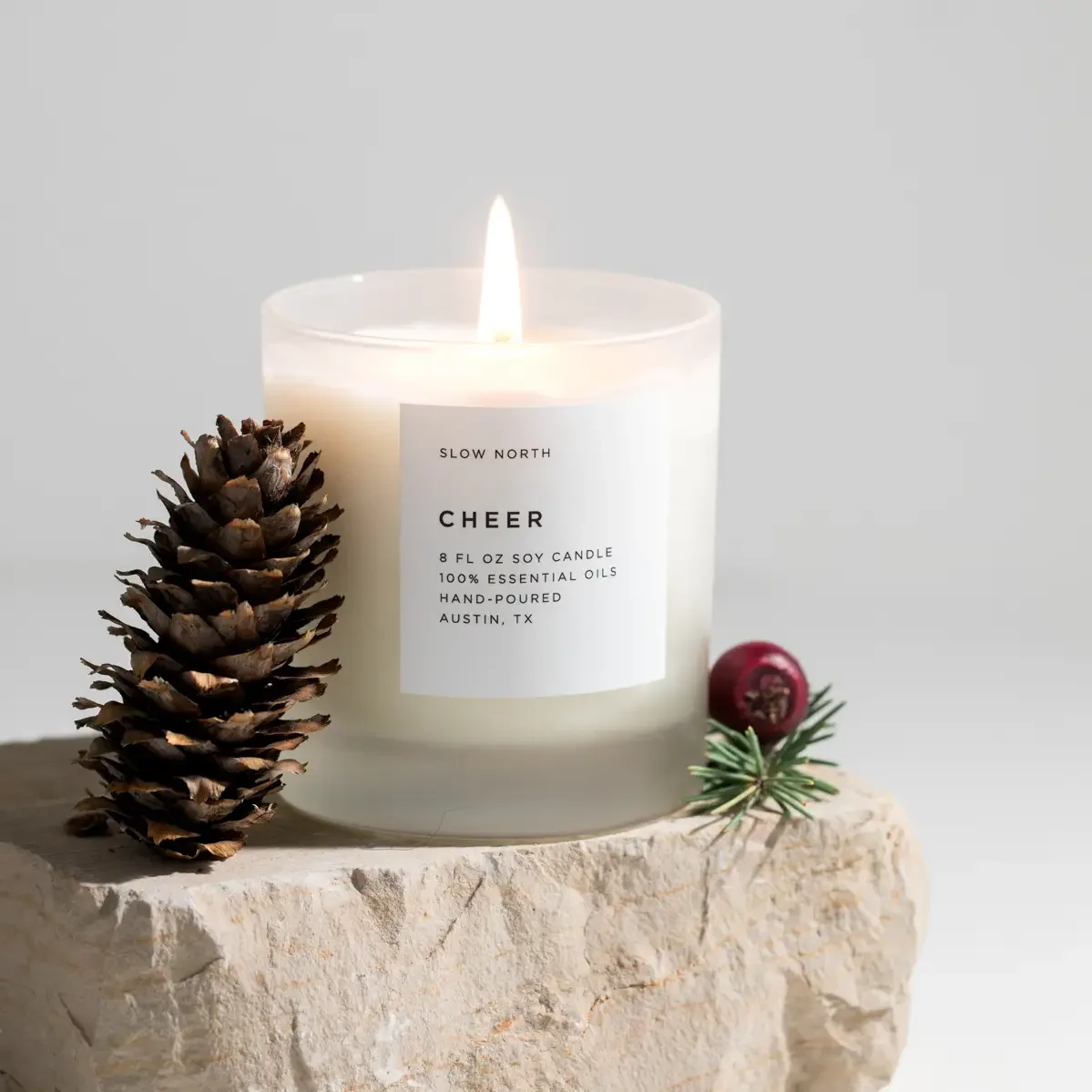 Balsam & Cedar Candle Trio Gift Set - Three frosted glass candles sit inside a beautiful box with hand painted art and pops of gold foil. Grounded in rich oak moss with a heart of fir needle kissed with warm cinnamon.