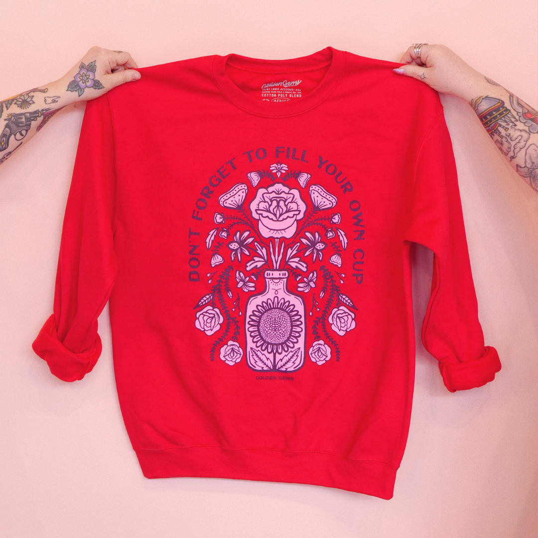 Created in-house with self-care in mind, Golden Gems’ Fill Your Own Cup Sweatshirt is your wearable reminder to prioritize yourself. It’s cozy, cool, and here to help you fill your own cup first.