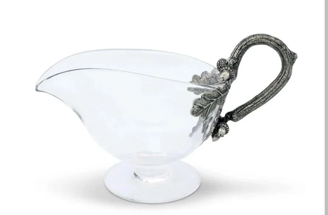 Elevate your dining experience with the Acorn Forest Gravy Boat from Vagabond House. Its classically footed design, embellished with pewter, exudes a sophisticated elegance. The figural branch handle and intricate acorn and leaf details add a touch of luxury to any table setting. Make a bold statement with this exquisite piece.