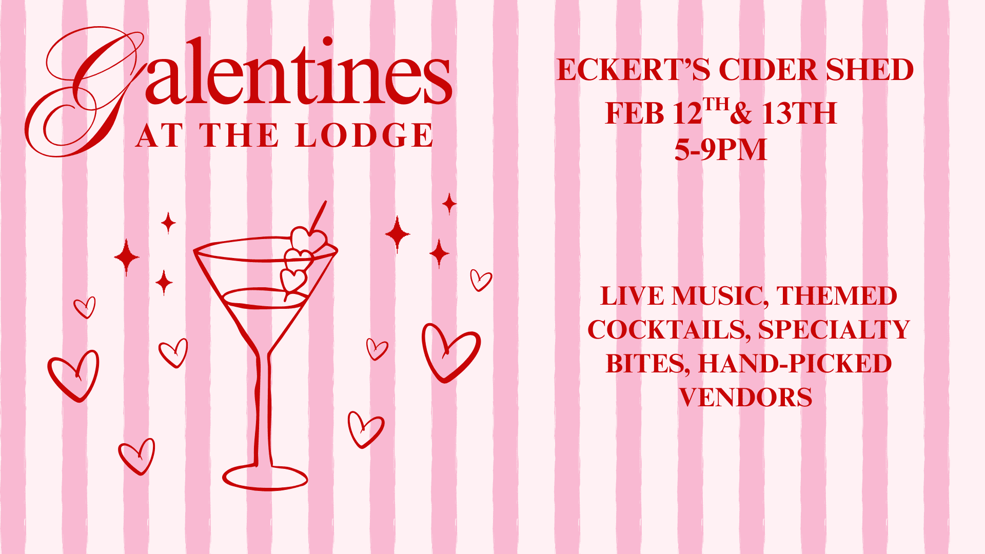 Galentine’s at The Lodge takes place Thursday, February 12, and Friday, February 13, from 4–9 PM. Round up your girlfriends for a night of laughter, sipping, and celebration, featuring live music, themed cocktails, special bites, interactive fun, and hand-picked vendors. Cozy up, shop a little, sip something pretty, and enjoy a winter evening made for friendship.