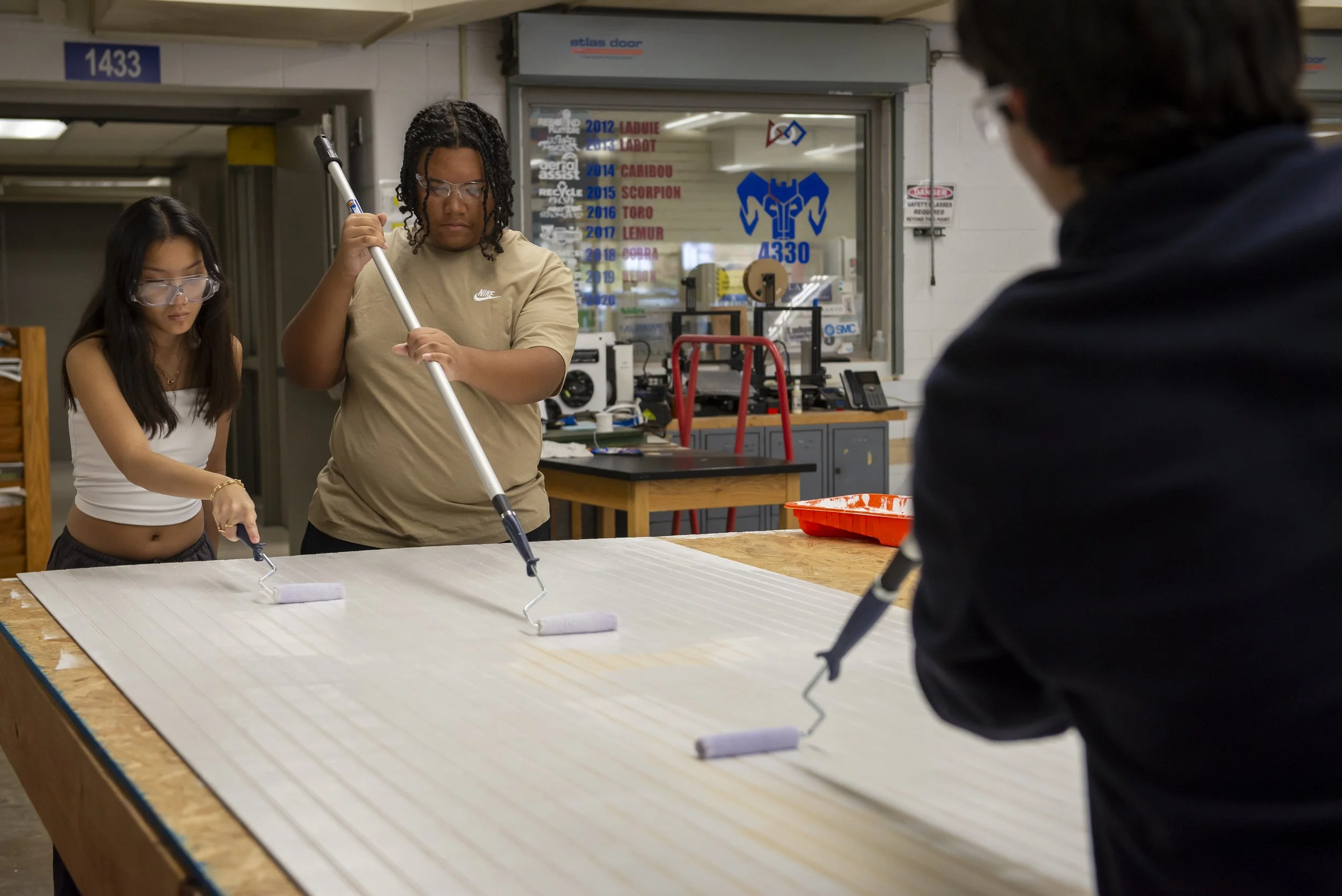 This is Goebel’s second year on the project. “It’s just so much bigger,” he said, eyes wide, through the roar of power tools; the rhythmic, and sometimes not so rhythmic, clunk of hammers on nails. But even though they have moved on to more elaborate projects, both he and Dixon think fondly of earlier “woods” classes and the fine work they produced: the coffee table which sits in Goebel’s living room to this day; the candy dispenser and soda-can lamp which, based on his smile and the misty look in his eye, still have a place in Dixon’s heart.
