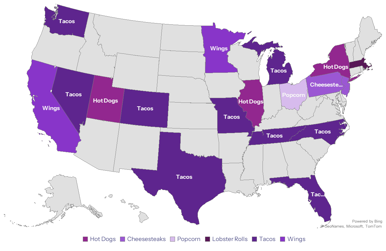 Wings (616K searches) take the second spot in front of Hot Dogs (431K searches). They were found to be most popular in California, Minnesota, New York, Illinois, and Utah.