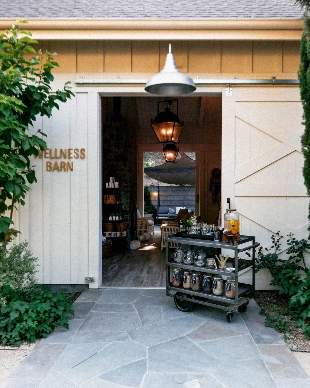 The casualness of a plethora of plantings, some with heavy blooms that graze the knees of guests traversing the pea-gravel paths between the various buildings—all designed to resemble agrarian structures with galvanized milk bucket light fixtures and corrugated metal roofing—belies their careful manicuring. Also abundant is the sound of running water, courtesy of rustic fountains and features that enhance the overall aura of tranquility.