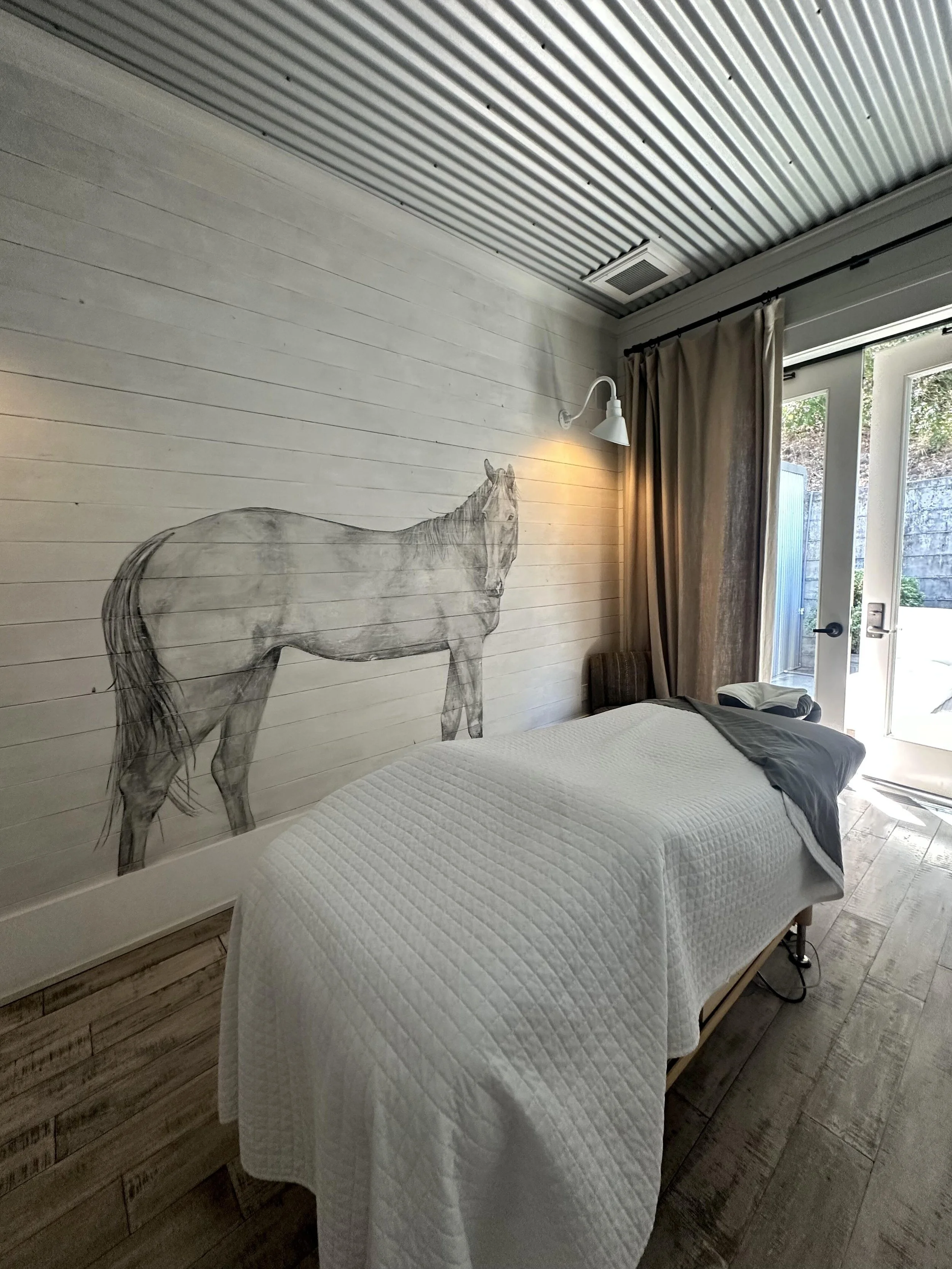 Sonoma artist Marci Davis was tapped to create striking black-and-white horse murals in the treatment rooms within The Wellness Barn.