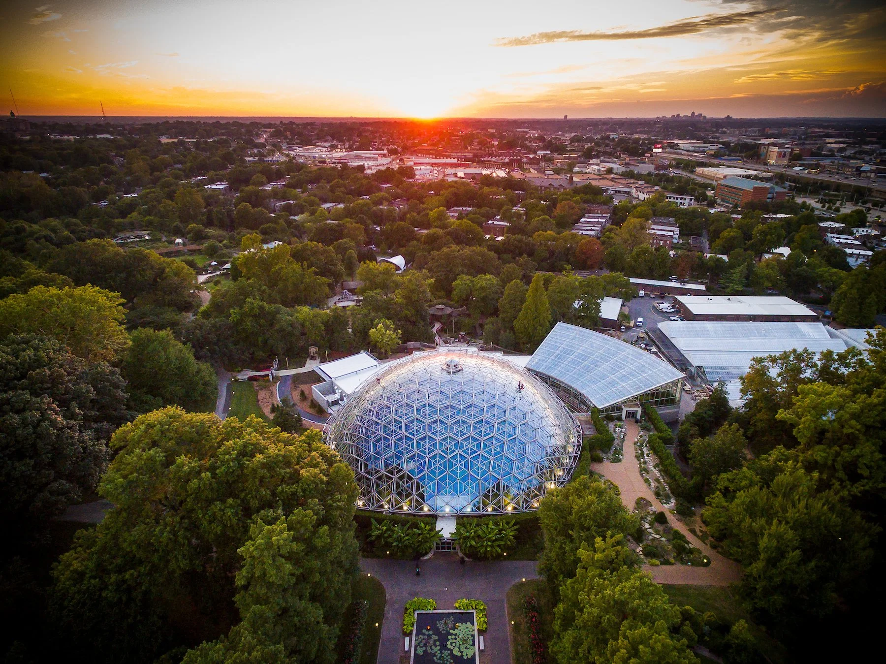 Drone photo of Climatron at sunset by Nathan Wambold.