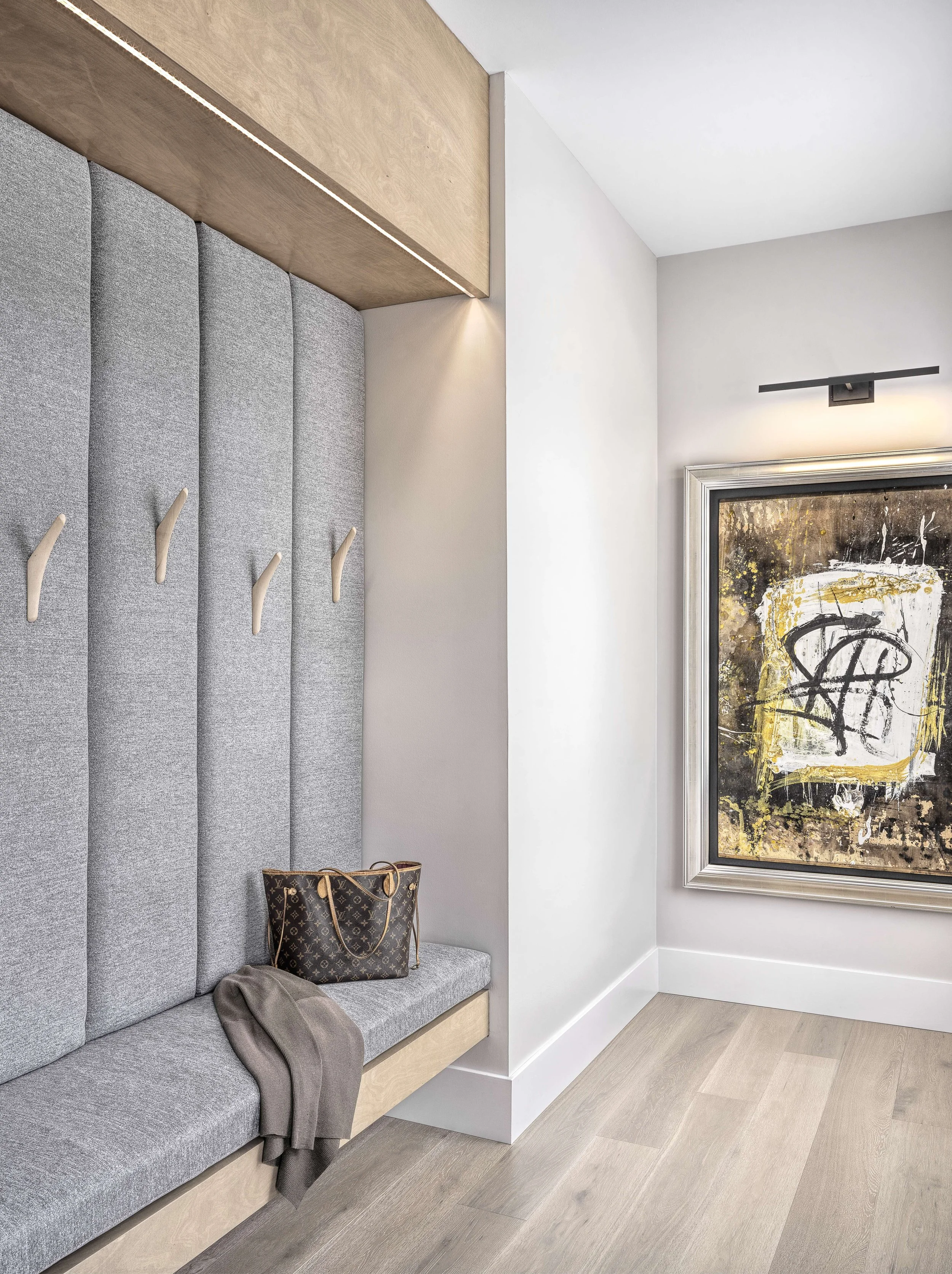 In the front foyer, a traditional coat closet was nixed and Abner added an upholstered bench to allow shoes to be removed and hooks on the wall for coats. “I really love that nook,” Abner says. “That’s one of my favorite design features in the house.”