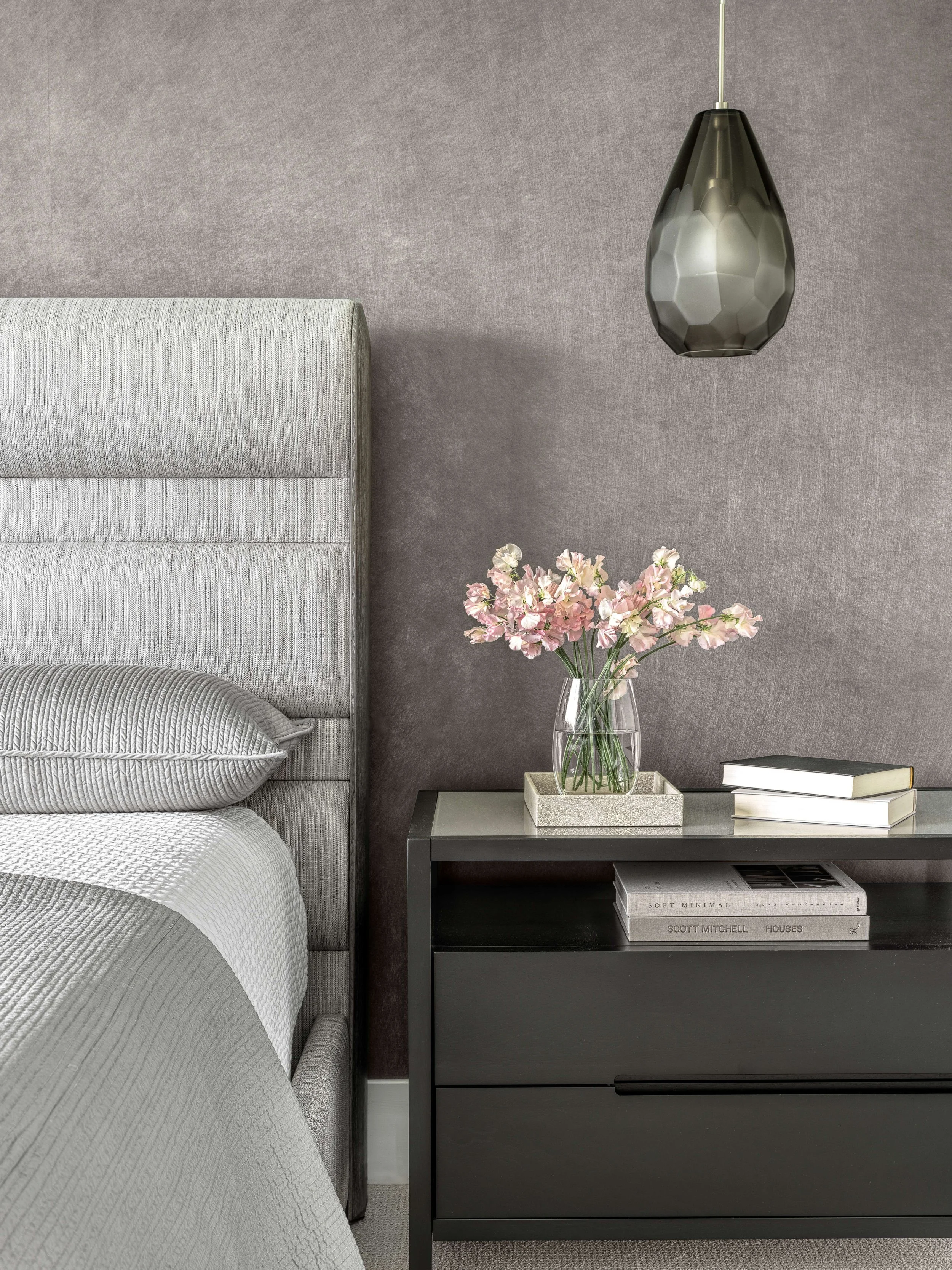 The master bedroom is a study in serenity — and gray. “I loved this bed, but I didn’t care for the fabric it came in, so I had it reupholstered,” she says.
