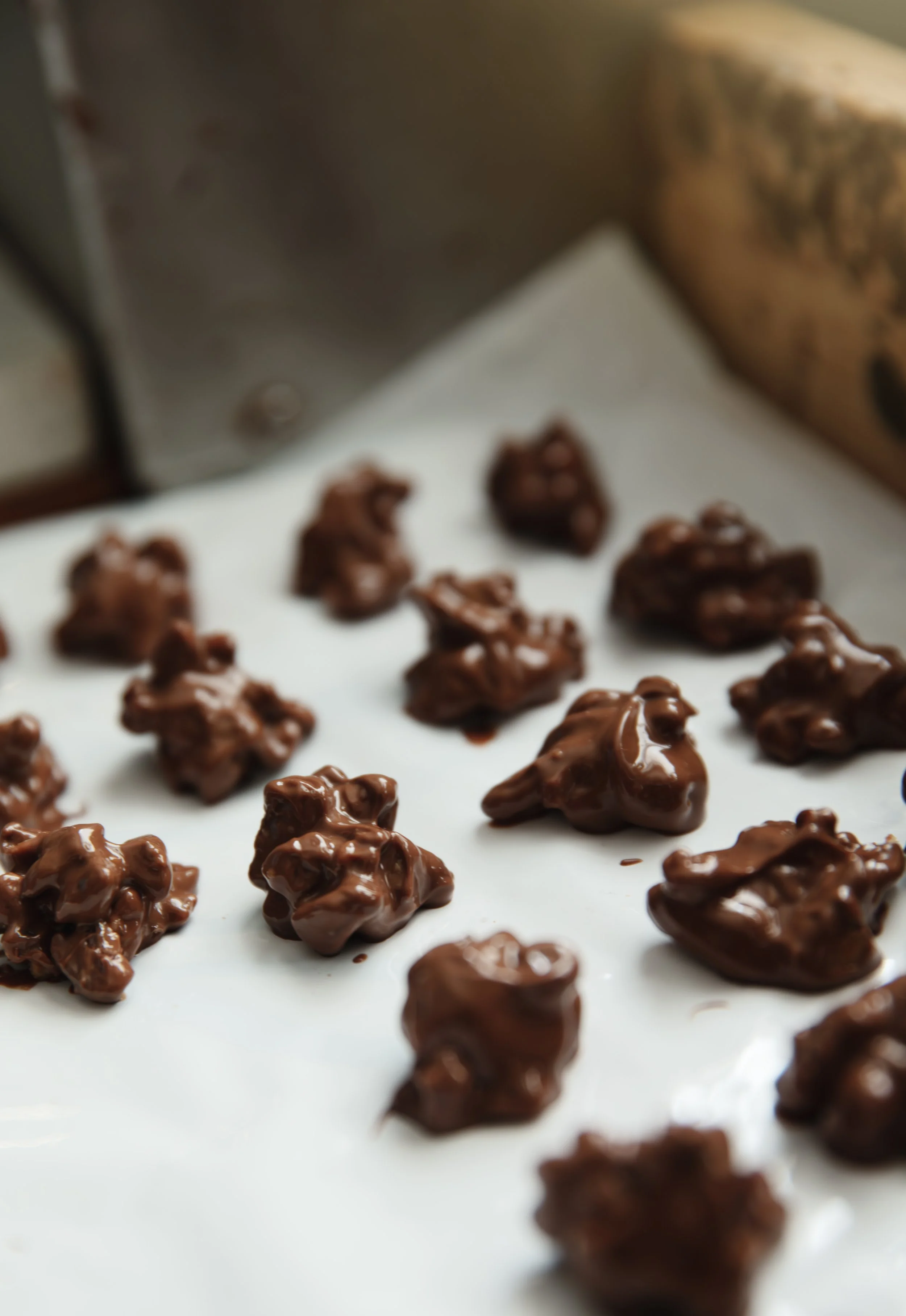 Maddie Wilson, meanwhile, is still in back, lifting lids, setting out molds, breaking into 50-pound cases of Guittard chocolate bars which she will shatter with a hammer. The air is cool, all-encompassingly deliriously sweet. So it’s no surprise to hear that sometimes, Wilson and Karandzieff dream in chocolate. “Particularly at Easter,” Wilson says. “But those are usually anxiety dreams – of having to dip with my left hand.”