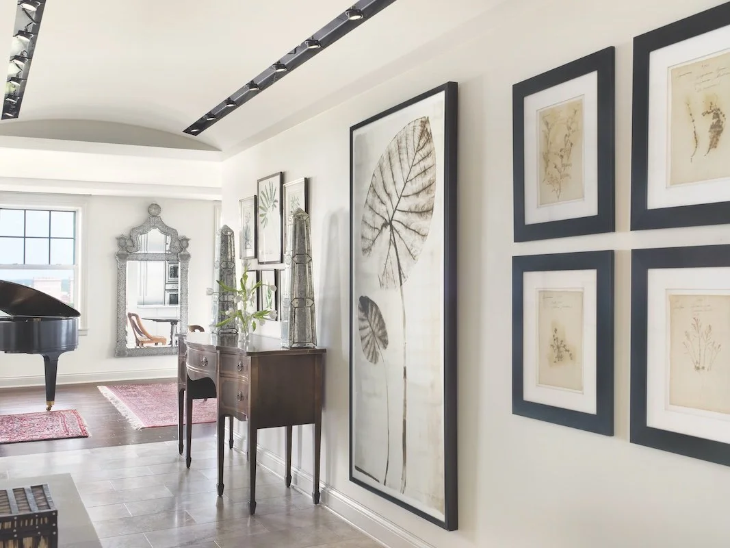 This made the condo an ideal pick for the couple to display their collections of botanical prints, naturalist paintings and photographs, mounted specimens, European pottery, antique garden statues, and a medley of furnishings that span four centuries which they have thoughtfully been amassing for decades. The overall effect is a strong connection to nature. About 180 recessed lights illuminate the 35 feet of gallery space, tall ceilings – which soar to 13.5 feet in the dual living spaces that flank the condo’s dining room – and remote-controlled built-in window shades all serve to highlight and protect the artwork within.