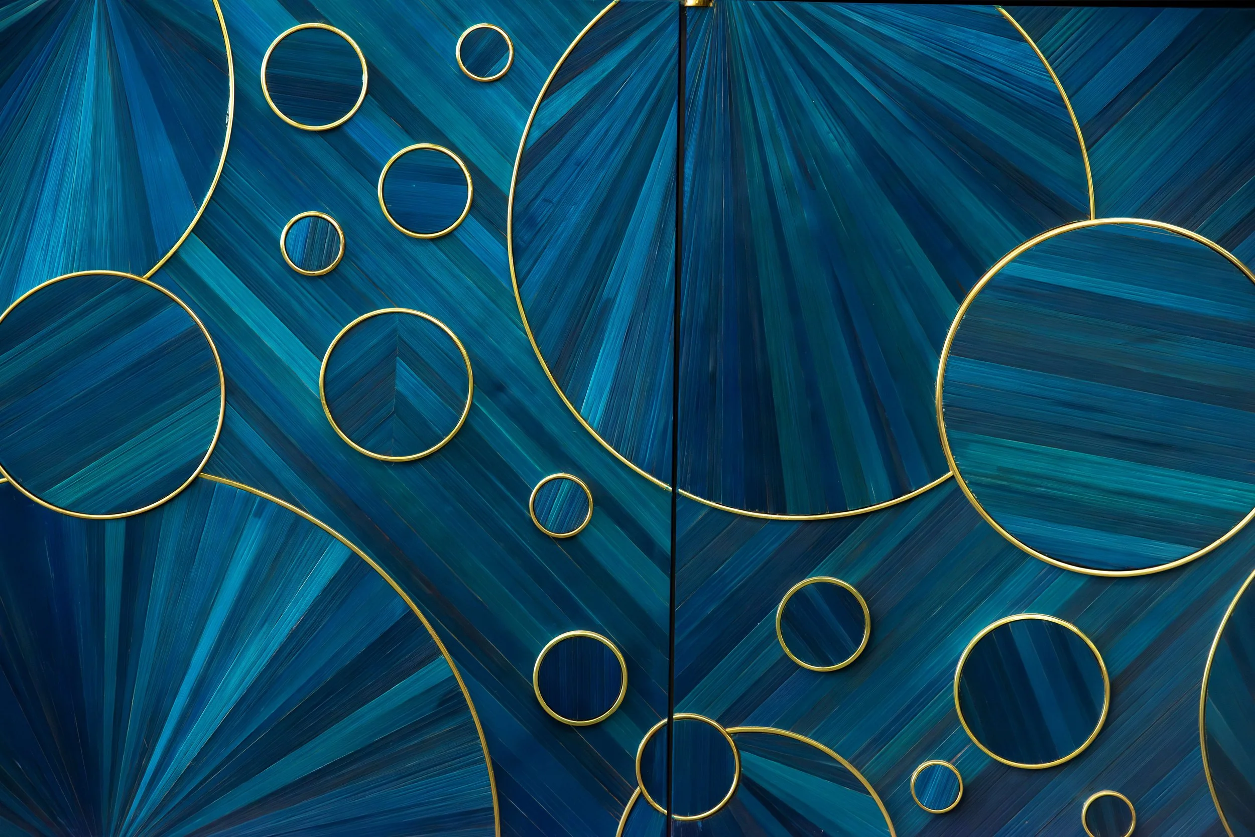 Slattery points out (though it’s pretty hard to miss) a “bubbled” peacock blue buffet. “I call it my Lawrence Welk cabinet,” he says, referring to the bubbly effects at the end of “The Lawrence Welk [TV] Show”, which he watched as a boy with his grandparents. Mid-century in style, the cabinet is a stunning example of marquetry, which is the art of applying pieces of veneer to a structure. In this particular instance, the veneer is blades of rye grass — dyed, steamed flat and ironed into ribbons which Slattery then meticulously laid within and around the decorative brass rings in various sizes. It took him months.
