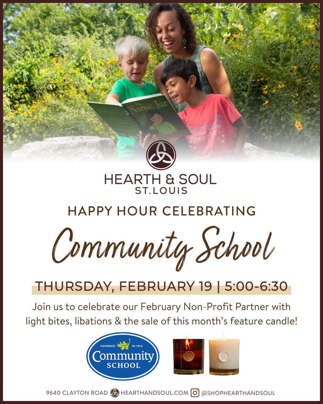 Join us this February to celebrate the Community, our Non-Profit partner of the month. Enjoy light bites, libations, cocktails, and the sale of this month's featured candle. 100% of the Net Profit sales will be donated to Community School!